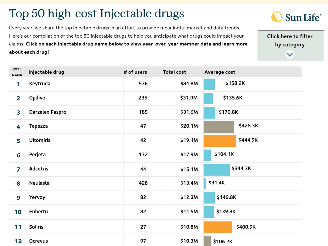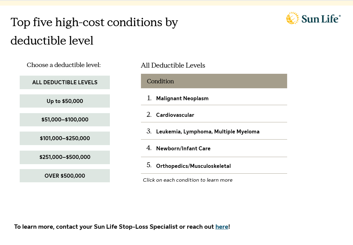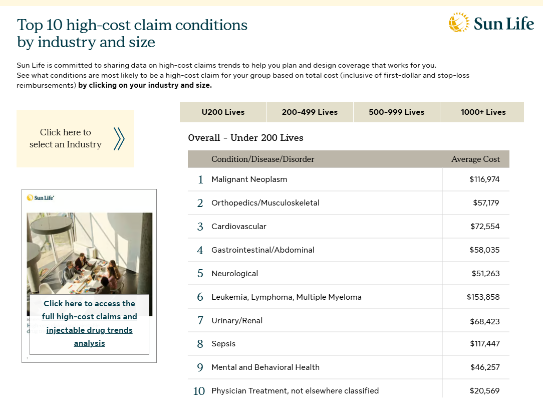 For the past 13 years, Sun Life has been at the forefront of analyzing our comprehensive claims data to empower self-funded employers. Our mission: to provide crucial insights into high-cost claims and injectable drug trends, enabling self-funded employers to make informed decisions that benefit both their employees and their bottom line.