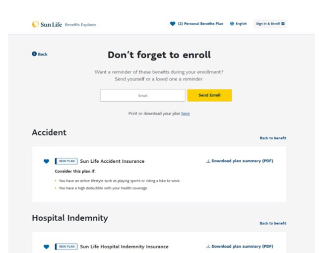 Employees can favorite the plans they want to enroll in to create their very own Personal Benefits plan. Benefits Explorer then directs them to the right place to enroll.
